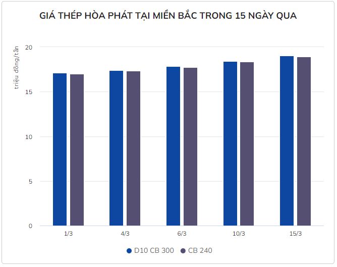 Các dòng thép của Hòa Phát ghi nhận mức tăng hơn 2 triệu đồng so với tháng trước. Tại miền Bắc, giá thép thanh vằn D10 CB300 từ mức 17,12 triệu đồng/tấn lên 17,42 triệu đồng/tấn (ngày 4/3), 17,83 triệu đồng/tấn (ngày 6/3), 18,43 triệu đồng/tấn (ngày 11/3) và 19,03 triệu đồng/tấn (ngày 15/3).
