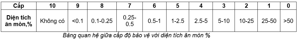 Kết quả thí nghiệm ăn mòn có thể được đánh giá theo các cấp độ bảo vệ, cấp độ bảo vệ càng lớn thì mức độ chống ăn mòn càng cao
