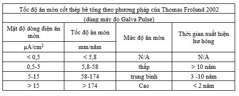 Năm 2002 nhà nghiên cứu Thomas Frolund dùng thiết bị GalvaPulse với nguyên lý điện hóa (Hình 6a) để tiến hành các thí nghiệm đo (Hình 6b) và lập dựng bảng dữ liệu mô tả sự liên quan dòng ăn mòn và tốc độ ăn mòn với thời gian có thể nhìn thấy bê tông bị hư hỏng (Bảng 1).