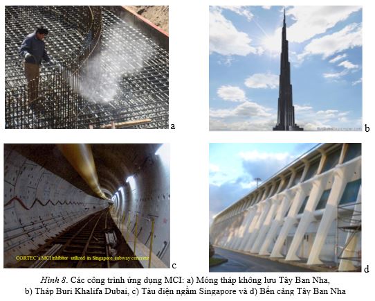 Hình 8 giới thiệu một số ứng dụng tiêu biểu của Cortec MCI cho các công trình tiêu biểu của thế giới như: a) phun lên cốt thép của móng tháp không lưu sân bay Barcelona, 2009, b) Tháp Buri Khalifa Dubai cao gần 800m với thể tích móng bê tông là 45.000m3 sử dụng Cortec MCI, 2005, c) Bê tông của tàu điện ngầm Singapore sử dụng Cortec MCI và d) Bến cảng Bilbao Tây Ban Nha sử dụng Cortec MCI, 2020