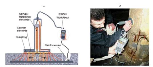Hình 6. Nguyên lý thiết bị đo GalvaPulse (a) và thực hiện quá trình xác định tốc độ ăn mòn cốt thép bê tông (b)
