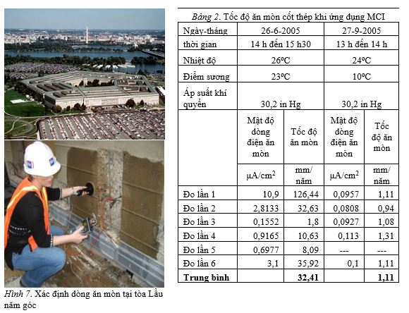 Một phần tòa nhà Lầu Năm góc sau sự kiện 11 tháng 9 bị hư hỏng và khi tiến hành sửa chữa người ta phát hiện các cốt thép bị đã ăn mòn rất nhiều. Cortec Corporation được Lầu Năm góc mời đến xử lý với dự án bắt đầu 2003 và kết thúc 2012 (Hình 7). Cortec Corporation dùng vữa MCI trát lên các khu vực hư hỏng và cứ 3 đến 6 tháng 1 lần tiến hành đo tốc độ ăn mòn cốt thép bằng thiết bị GalvaPulse. Bảng 2 trình bày kết quả đo 2 thời điển năm 2005 cho thấy chỉ sau 3 tháng tốc độ ăn mòn cốt thép giảm từ 32,44 μm/năm xuống còn 1,11 μm/năm.