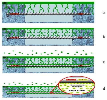 Việc sửa chữa công trình, nhất là móng, mà cốt thép đã bị rỉ thì MCI được dùng dưới dạng vữa trát lên bê tông và sau thời gian MCI sẽ thẩm thấu qua bê tông tới thép để ức chế ăn mòn là giảm tốc độ rỉ của thép (Hình 5). Trát lớp vữa MCI (màu xanh) lên bề mặt bê tông bị hỏng (Hình 5a) và MCI sẽ thẩm thấu qua bê tông theo nguyên lý mao dẫn. Nhờ tính năng phân tán và bay hơi nên MCI sẽ nhanh chóng tiếp cận đến bề mặt thép (Hình 5b). Do MCI có ái lực rất lớn với kim loại nên các phân tử MCI hấp phụ thành lớp màng ức chế bao bọc quanh cốt thép, ngăn cách thép tiếp xúc với các tác nhân ăn mòn. Màng ức chế có chứa nitơ và có điện trở cao, nên cũng có tác dụng làm giảm dòng điện ăn mòn. Ngoài ra Cortec MCI có thêm tính năng đặc biệt mà các MCI thông thường khác không có là khả năng phân cực thành các ion âm và dương, tiếp cận các khu vực điện tích trái dấu, làm cân bằng điện tích bề mặt do đó giảm tốc độ ăn mòn điện hóa (Hình 5d).