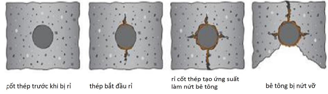 Hình 3. Sơ đồ mô tả các bước phá hủy bê tông do cốt thép bị rỉ